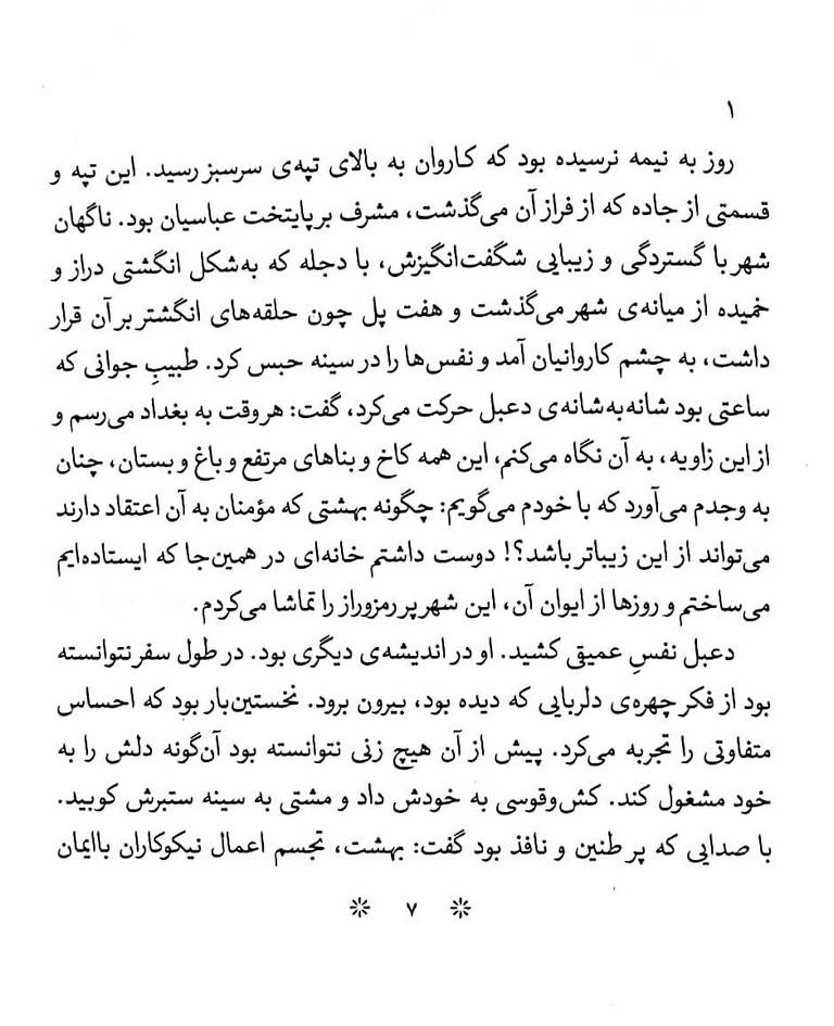 در طول رمان، شخصیتهای اصلی شامل دعبل، زلفا و طبیب، با کرامات اهل بیت و عشق متقابلشان، مسیر تکامل فردی و معنوی خود را طی میکنند. لحظات مربوط به زندگی امام موسی بن جعفر (ع) و امام رضا (ع)، زندان هارونالرشید و صحنههای دیدار با امام، از برجستهترین بخشهای کتاب هستند که حس عاطفه و ایمان را همزمان در خواننده زنده میکنند.