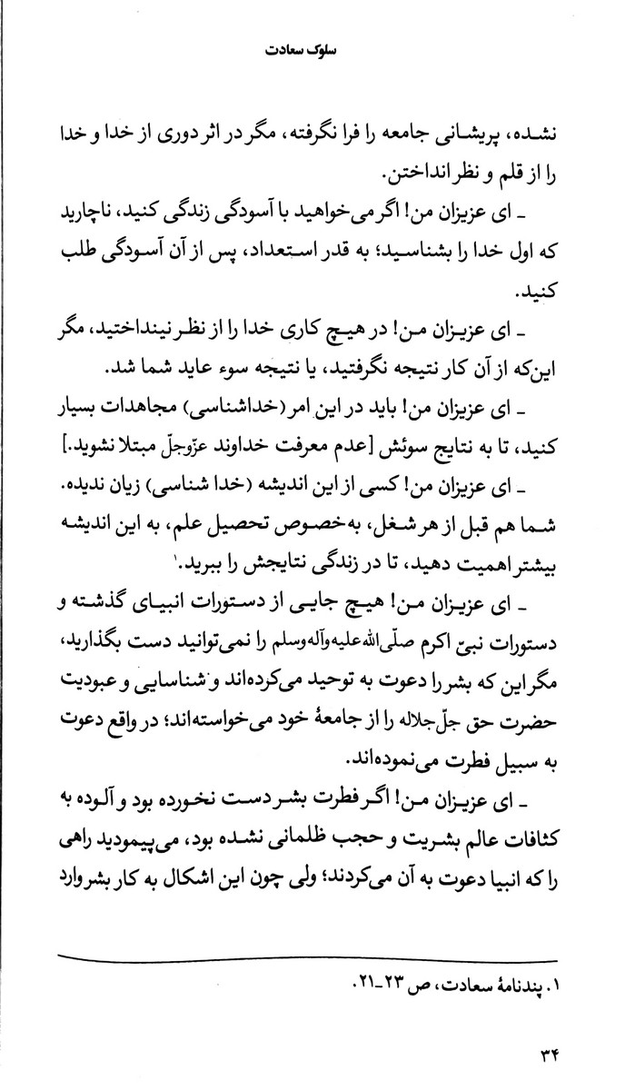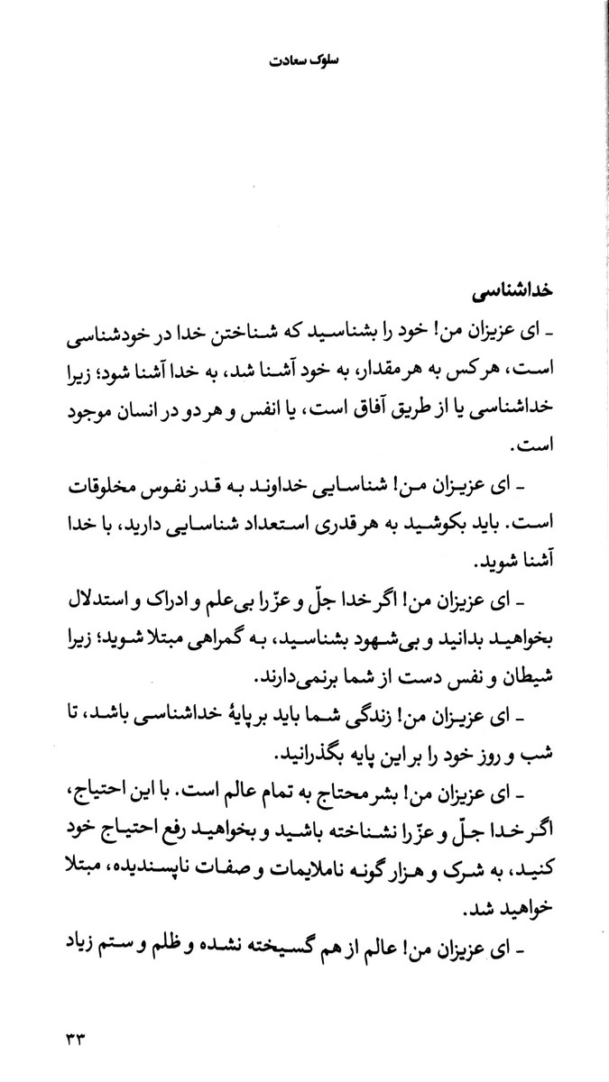 ای عزیزان من! اگر می خواهید با آسودگی زندگی کنید، ناچارید که اول خدا را بشناسید، به قدر استعداد، پس از آن آسودگی طب کنید.